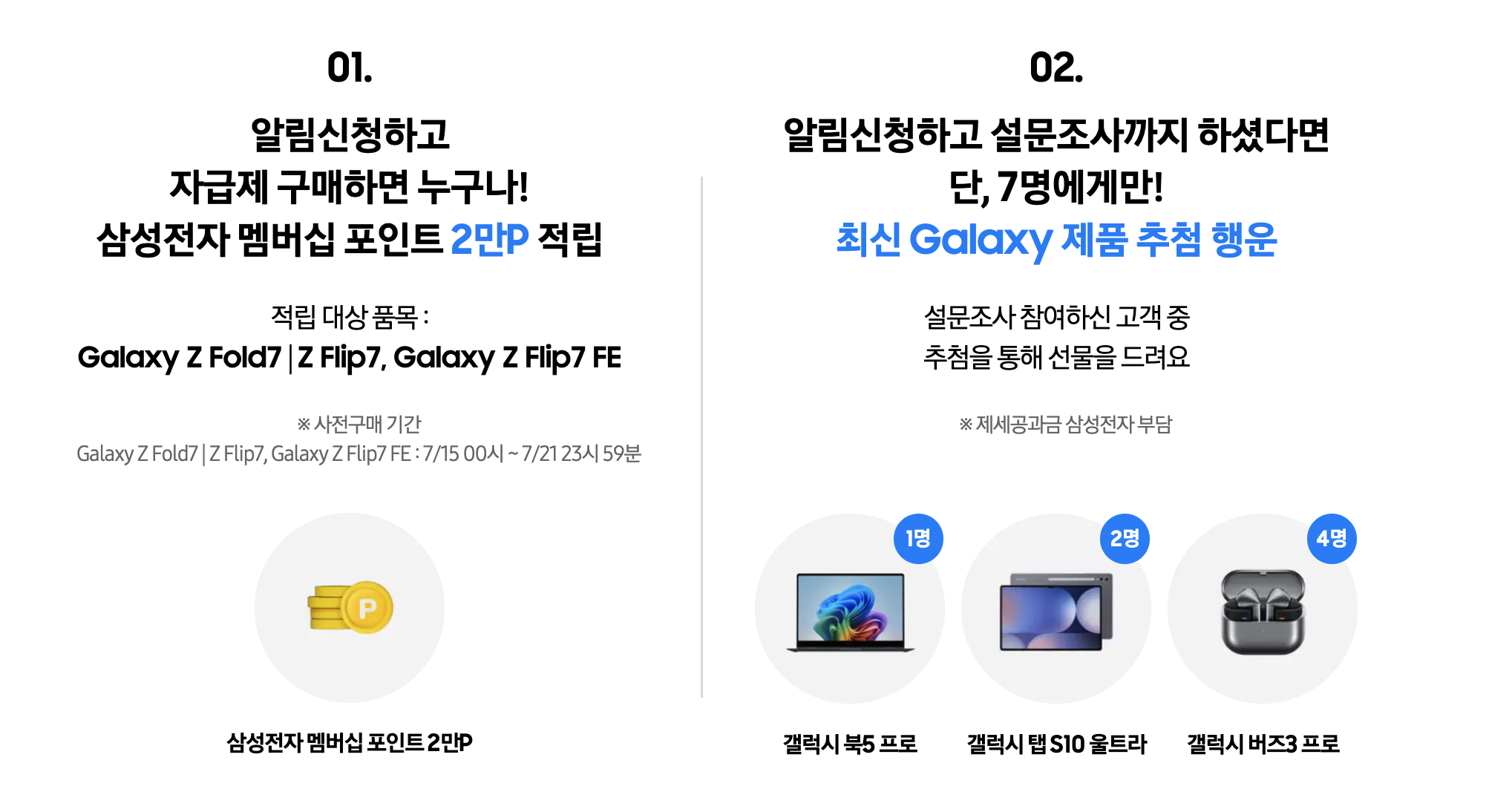 이번 갤럭시 플립7, 폴드7 사전판매는 7월 15일부터 21일까지 7일간 진행되며, 정식 출시는 7월 25일입니다. 삼성 사이트에서 사전예약 알림신청 하셔서 혜택도 받아가세요!