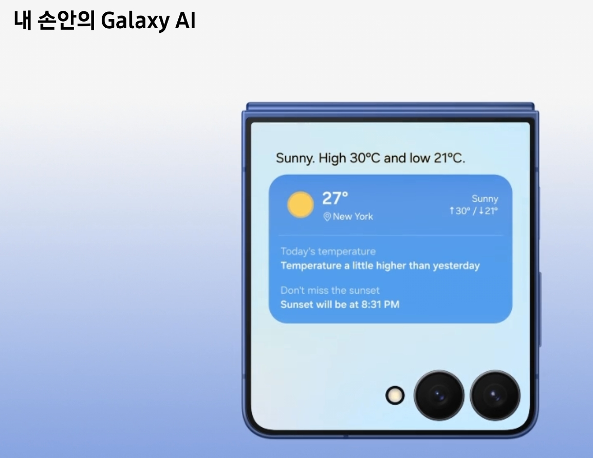 커버 디스플레이 활용이 재미있어요. 한 손 줌 슬라이더, 실시간 필터 적용으로 셀피가 편해졌고, Gemini AI와 연동해 여행지 날씨 기반 옷 추천까지 가능합니다. "플립이라서 가능한 재미있는 기능"이라는 평가예요.