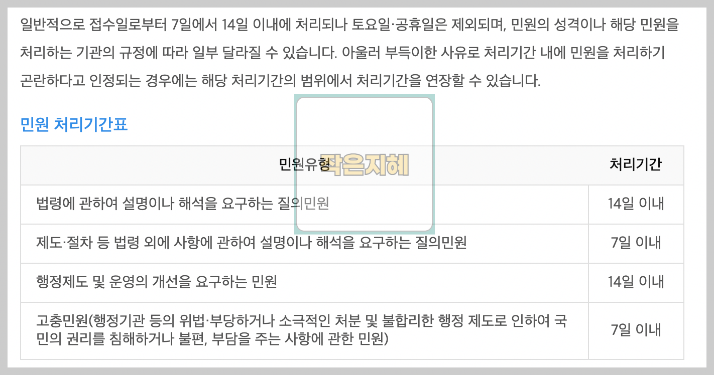 • 제출 후 민원 번호를 받게 되며, 이를 통해 처리 상태를 조회할 수 있습니다. 처리 기간은 법정 기준에 따라 다르며, 일반적으로 접수 후 배정, 확인, 답변 등록 등의 과정을 거칩니다.