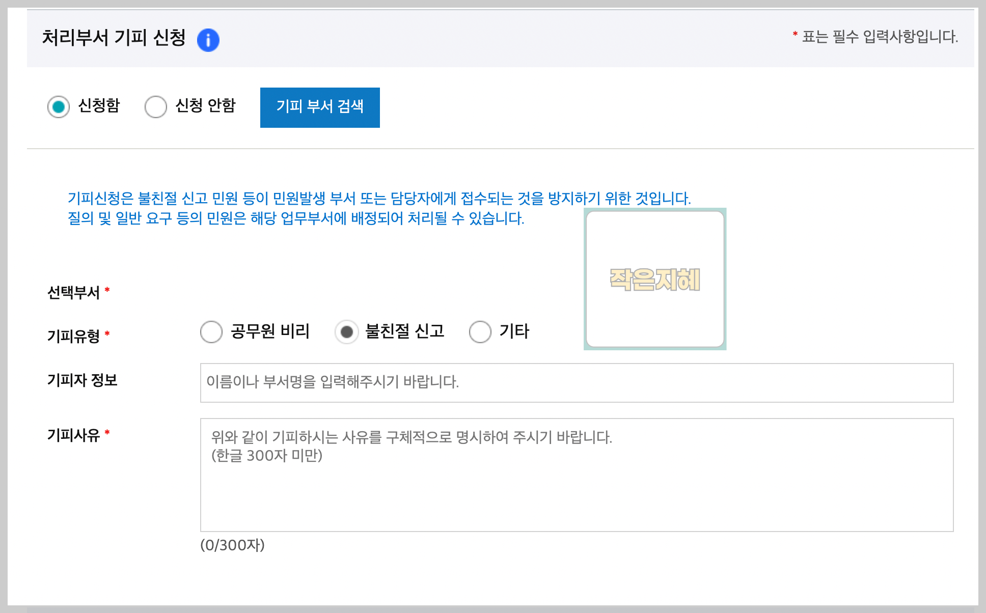 • 당초 민원을 처리한 부서에서 처리하기에 적합하지 않다고 판단되는 경우 해당 부서의 기피 신청도 가능해요