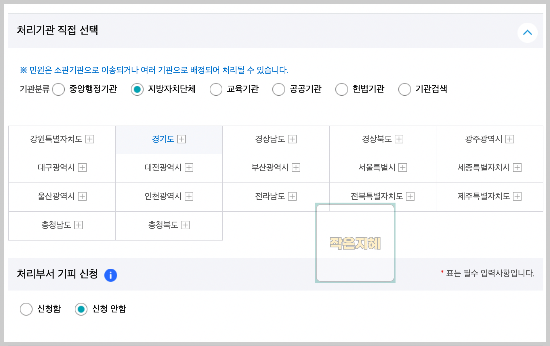 • 민원을 처리할 적절한 행정기관을 선택합니다. 소관 기관이 아닐 경우 자동으로 이송됩니다.