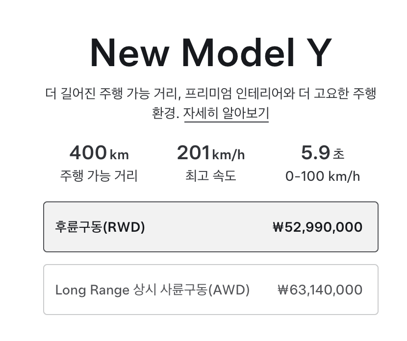 모델Y 주니퍼의 RWD 트림 가격은 5,299만 원, 롱레인지 AWD는 6,314만 원부터 시작합니다. 여기에 컬러, 인테리어, 오토파일럿 옵션을 추가하면 가격은 더 올라갑니다.
